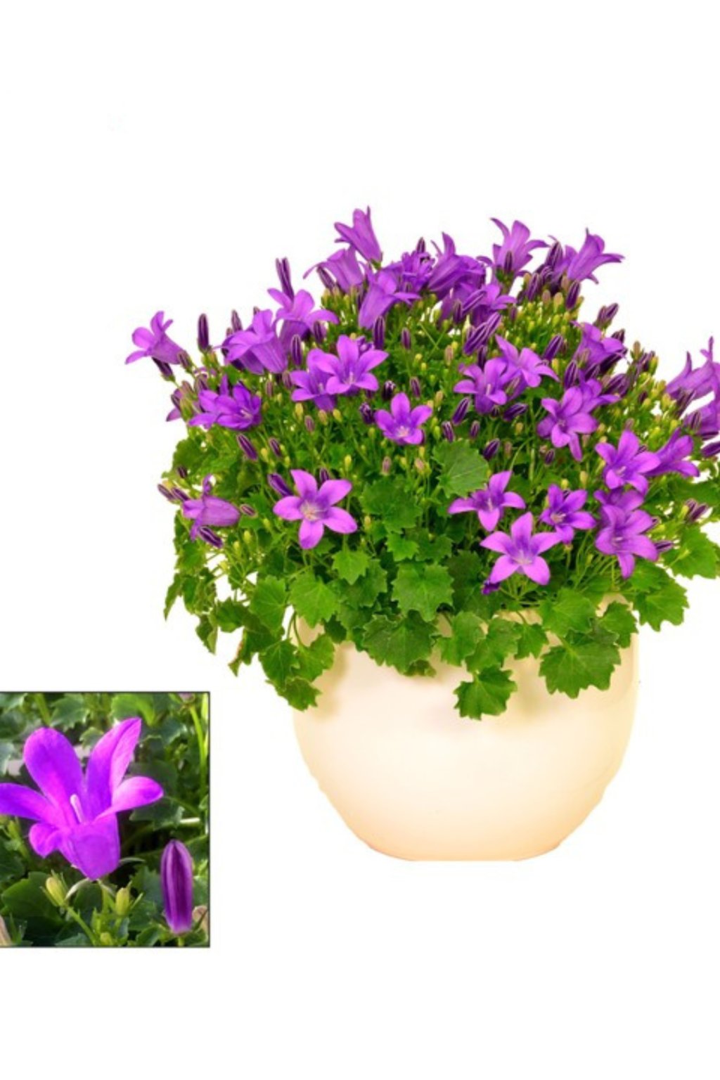 Campanula, známa ako zvonček, je obľúbená okrasná rastlina s bohatým a dlhým kvitnutím. Vytvára kompaktné trsy plné jemných zvončekovitých kvetov v intenzívnej fialovej farbe, ktoré krásne kontrastujú so sviežo zelenými listami. Pôsobí sviežo, romanticky a je ideálna na jarnú a skorú letnú výzdobu.